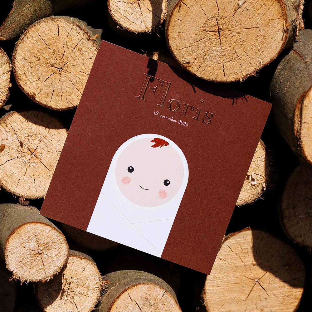 Een eenvoudig maar o zo stijlvol geboortekaartje met ingebakerde baby met bruine haren! Less is more! Liever een andere kleur? Dit kun je zelf aanpassen in de editor.