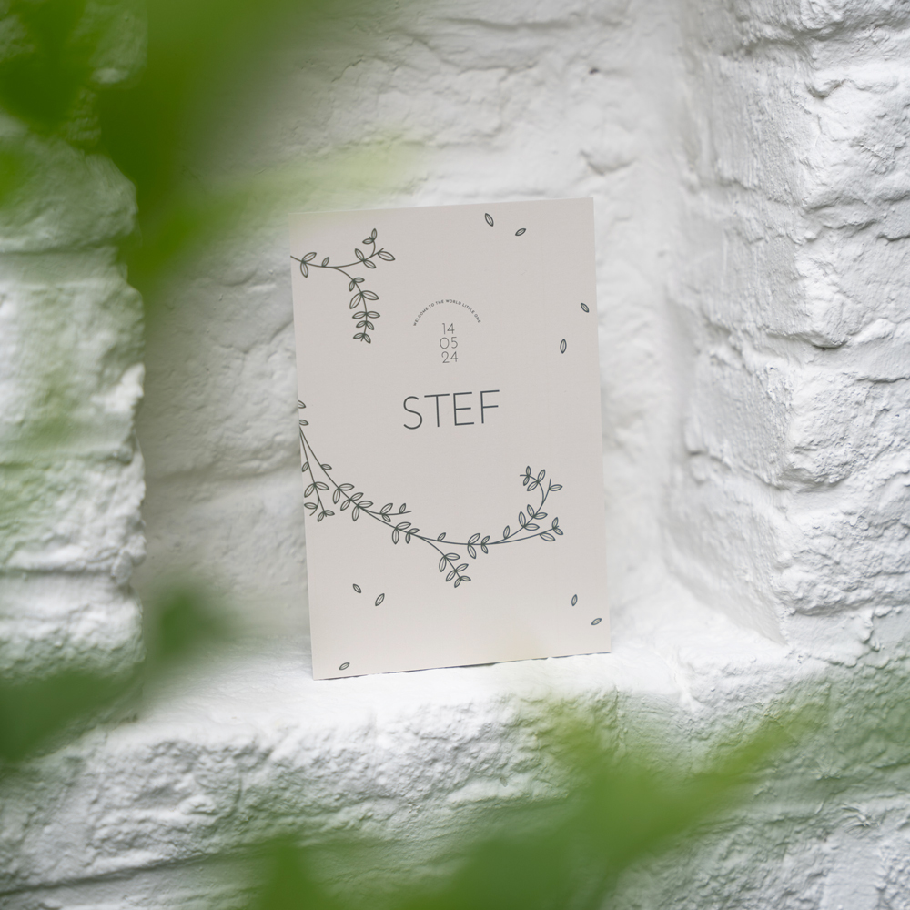 Op zoek naar het perfecte geboortekaartje? Ontdek onze prachtige Geboortekaartje Olijf! Dit zachte en stoere typografische babykaartje straalt luxe uit dankzij de gekleurde foliedruk. Wil je de kleur aanpassen? Geen probleem, pas het eenvoudig aan in de editor. Onze makers geven je graag handige tips. Vergeet niet om altijd een proefdruk te maken om er zeker van te zijn dat de kaart naar wens is. Kies voor de papiersoort linnen voor een extra luxe uitstraling. Sluit de envelop af met een passende sluitzegel voor een perfecte finishing touch. Dit geboortekaartje is perfect voor liefhebbers van bohemian, botanische en romantische stijlen. Wil je het kaartje in een ander formaat, met ronde hoeken of heb je nog andere vragen? Laat het ons weten via de mail! We helpen je graag verder en kijken samen naar de mogelijkheden.