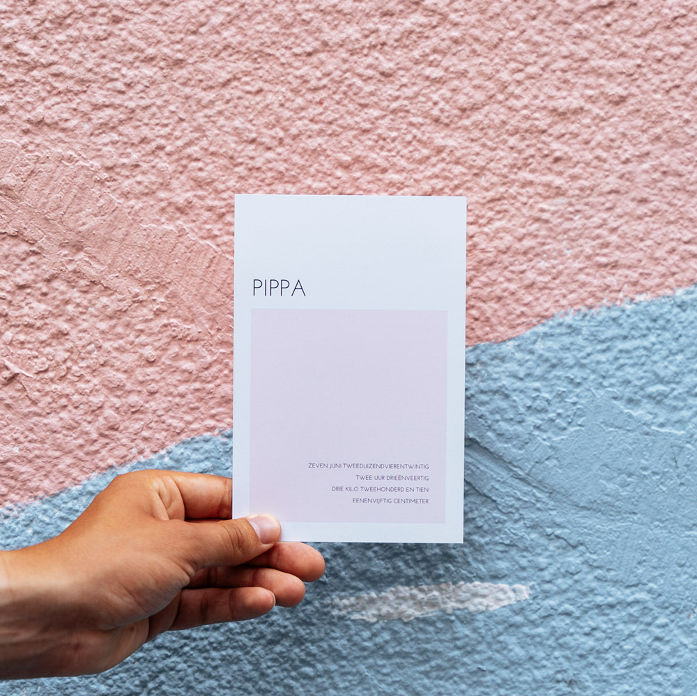 Deze geboortekaart is perfect voor elk seizoen en brengt een klassieke en stijlvolle uitstraling naar de geboorte van jullie baby. De combinatie van roze tinten en strakke blokken zorgt voor een eigentijdse en elegante uitstraling.