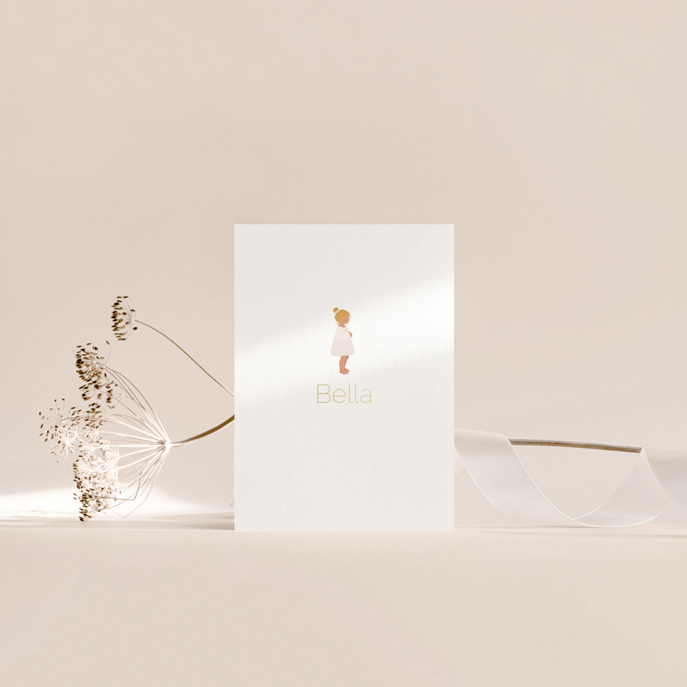 Een prachtig eenvoudig geboortekaartje met een meisje met blonde haren. Liever een andere kleur? Dit kun je zelf aanpassen in de editor.