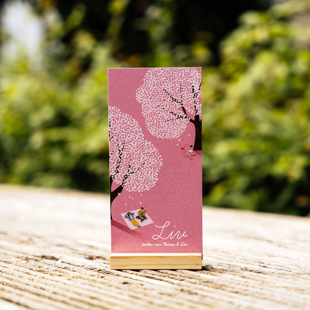 Een romatisch prachtig geboortekaartje met rustende ouders in bloesemlandschap. Pas de tekst aan en bestel een proefdruk!