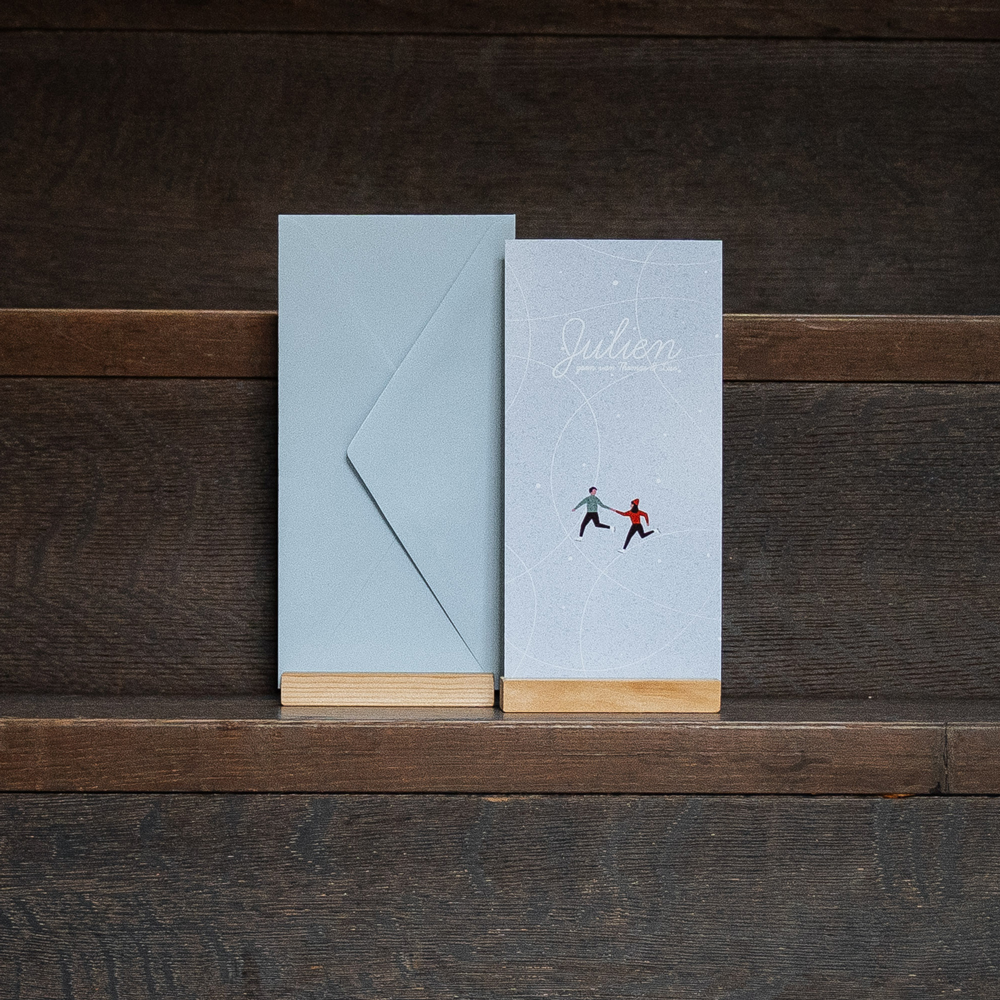 Een romatisch prachtig geboortekaartje met schaatsende ouders in winterlandschap. Pas de tekst aan en bestel een proefdruk!