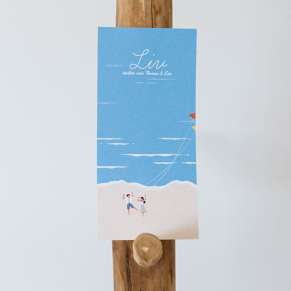 Een zomers romatisch geboortekaartje met spelende ouders met vliegers aan de zee. Pas de tekst aan en bestel een proefdruk!