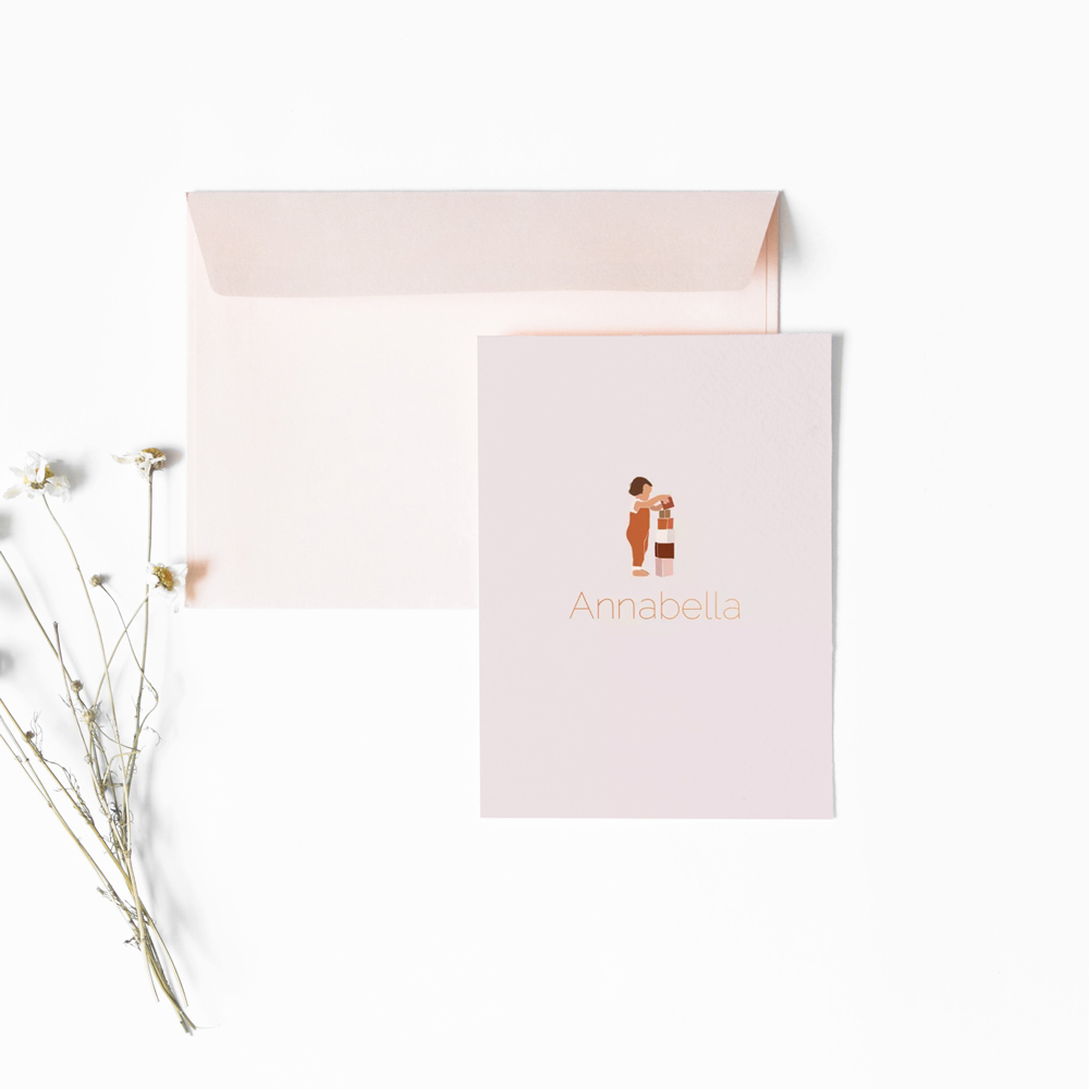 Een prachtig geboortekaartje met een super schattige spelende kleuter met blokken. Liever een andere kleur? Dit kun je zelf aanpassen in de editor.
