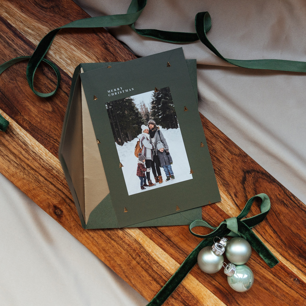 Een parchtige kerstkaart met glinsterende kerstboompjes!