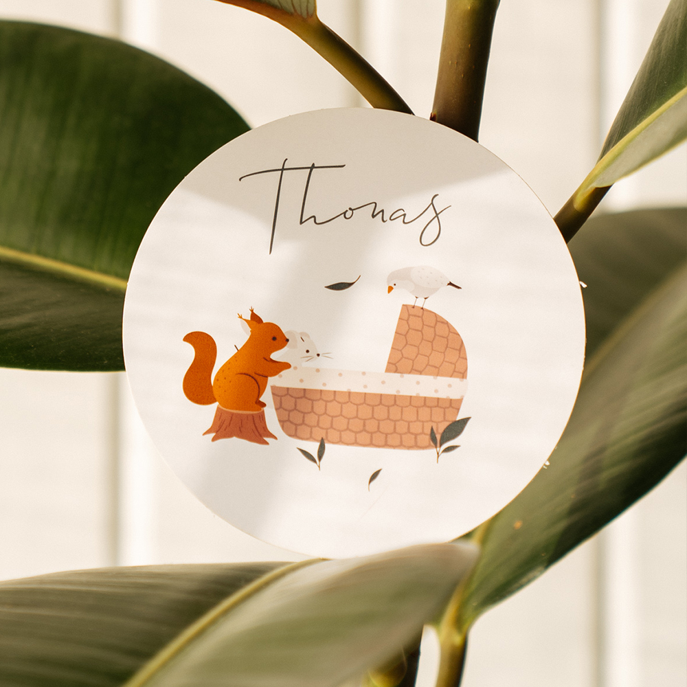 Een super lief geboortekaartje in ronde vorm. Met schattige bosdieren en een babymandje vol geluk!