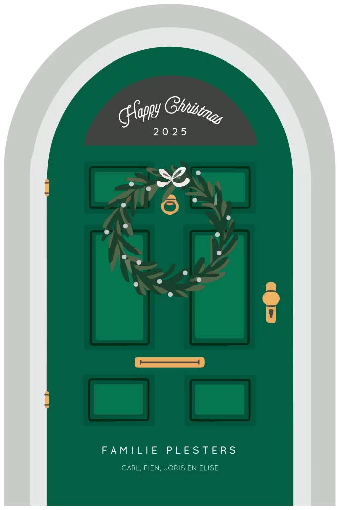 Wat een ongeloofelijk mooie kerstkaartje, is de vorm van een groene ronde voordeur met kerstkrans!
