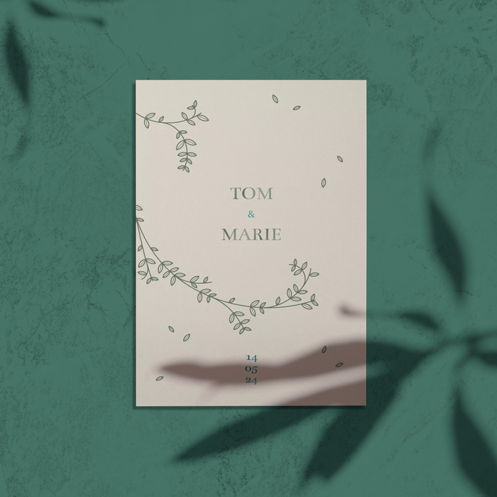 Op zoek naar de perfecte trouwkaart? De Trouwkaart Olijf is precies wat je nodig hebt. Met zijn zachte en stoere typografie en de toevoeging van gekleurde foliedruk, straalt deze kaart pure luxe uit. En het beste van alles? Je kunt de kleur gemakkelijk aanpassen in de editor, zodat de kaart perfect aansluit bij jullie stijl. Onze makers hebben nog wat handige tips voor je. Maak altijd een proefdruk, zo weet je zeker dat de kaart eruitziet zoals je in gedachten hebt. Kies daarnaast voor de papiersoort linnen voor een extra luxe uitstraling. En vergeet niet de envelop te sluiten met een passende sluitzegel voor dat extra beetje elegantie. Wil je het kaartje in een ander formaat, ronde hoeken of heb je andere vragen? Geen probleem, mail ons en we helpen je graag verder. We staan klaar om samen met jou te kijken naar alle mogelijkheden.